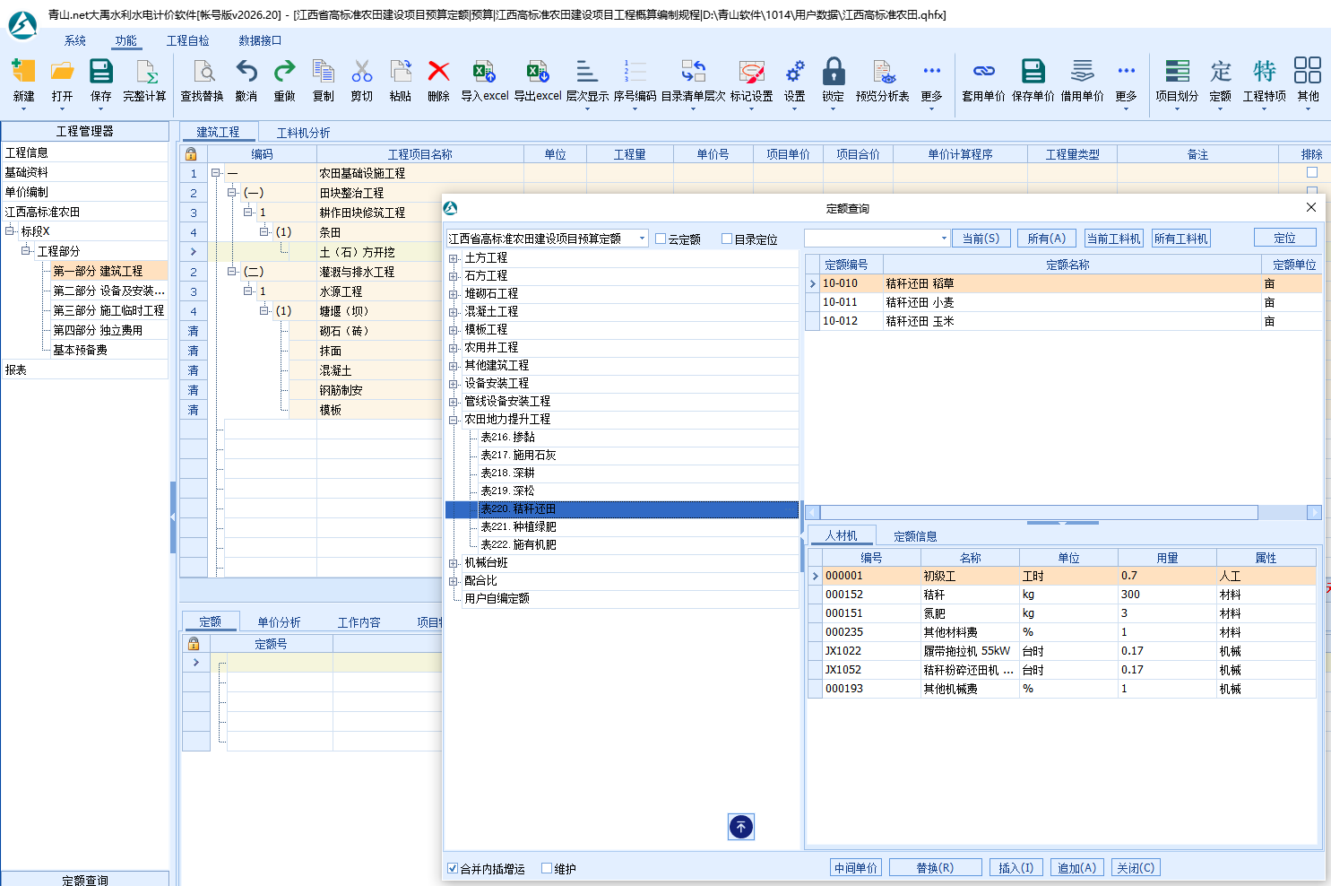 地方标准精准适配:内置《高标准农田建设项目预算定额》(DB36/T 2180)《施工机械台时费定额》等江西最新地方标准及国家相关规范,系统覆盖土方工程、石方工程、混凝土工程、农用井工程、农田地力提升工程等十大类工程的定额标准。支持定额换算、补充定额自定义录入,彻底解决过往多部门定额混用的问题,确保计价成果精准合规。