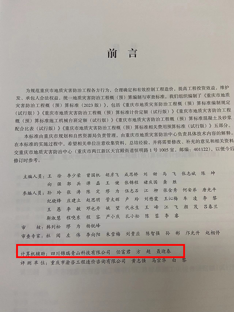 除协助编制《重庆市地质灾害防治工程概(预)算标准(2023版)》外,我司还承担了重庆市地质灾害防治中心《重庆市地质灾害防治工程概预算定额及相关费用标准》软件编制项目,完成了与标准配套的重庆市地质灾害防治工程计价软件的开发,并顺利通过验收,与《重庆市地质灾害防治工程概(预)算标准(2023版)》纸质版同步发售。并将作为唯一指定软件,在重庆市地质灾害防治中心组织的《重庆市地质灾害防治工程概(预)算标准》(2023版)宣贯培训会上亮相。