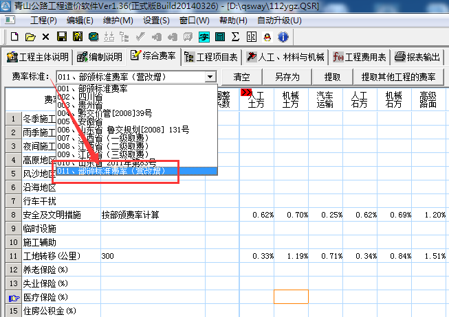 2、费率标准,选择‘011部颁标准费率(营改增)’标准,已经对通知中的营改增其他