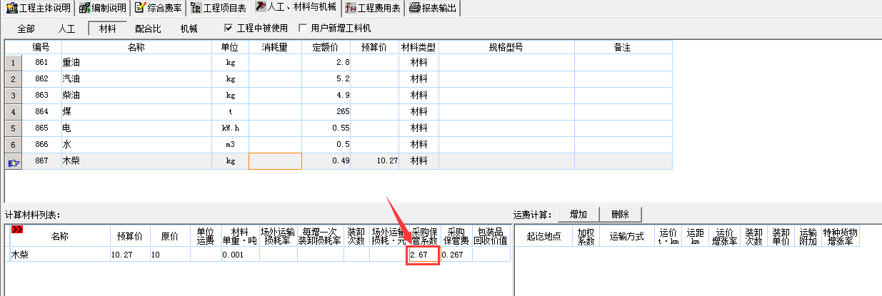 3、材料采购及保管费,因涉及是否外购的成品或半成品,两个费率不一样,由用户自己输入,软件没有默认计取,标准为: