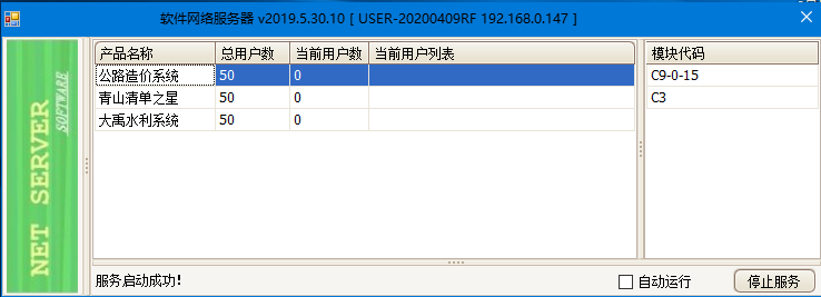 1、在服务器端运行安装该程序,安装完成后插入网络加密锁再启动软件,即可以看到所购的节点数和当前连接的节点数。