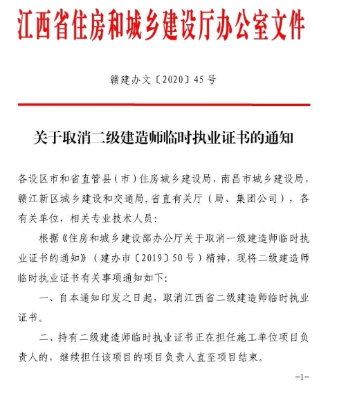 <转>江西省住房和城乡建设厅《关于取消二级建造师临时执业证书的通知》