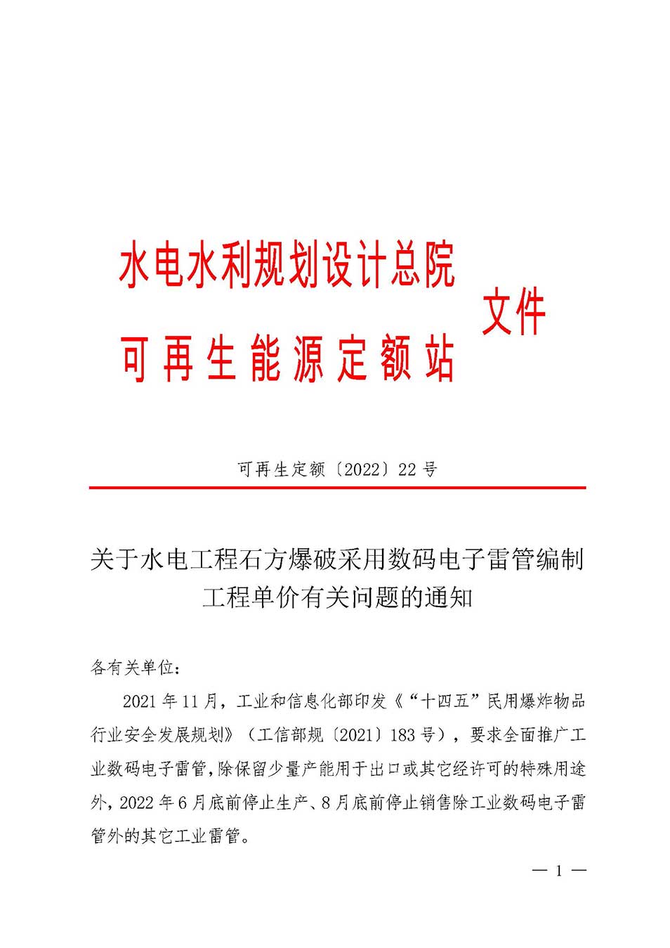 现行《水电建筑工程概算定额(2007年版)》《水电建筑工程预算定额(2004年版)》(以下简称《定额》)石方(含孤石)爆破子目采用电雷管或非电毫秒雷管进行编制。为适应全面推广工业数码电子雷管的政策要求,合理确定水电工程石方爆破单价水平,我站已启动相关计价依据修订的研究工作。在修订成果正式发布前,依据现行水电工程行业定额标准编制投资估算、设计概算中石方爆破工程单价时可暂按以下方式进行调整: