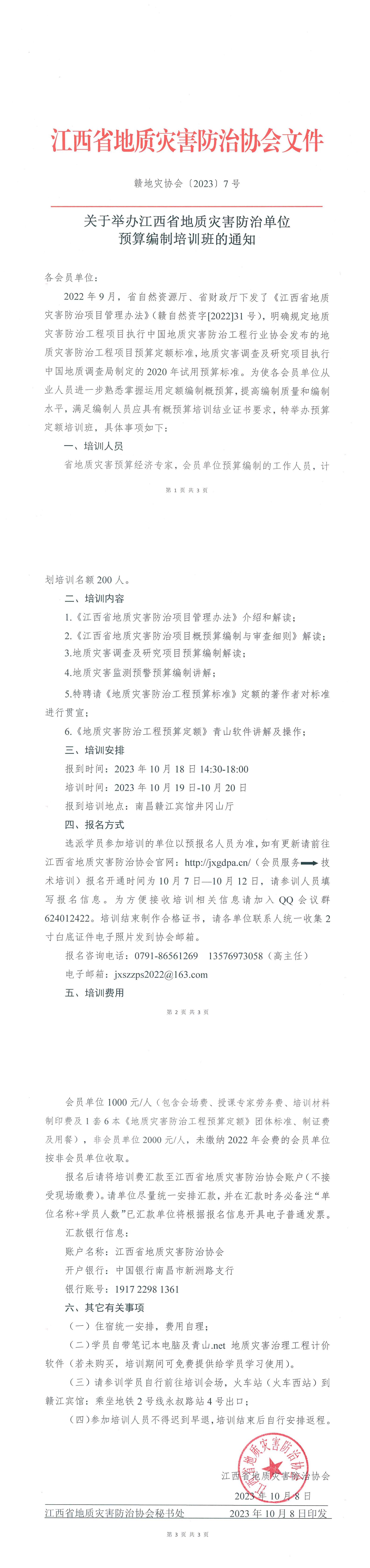 <转>关于举办江西省地质灾害防治单位预算编制培训班的通知