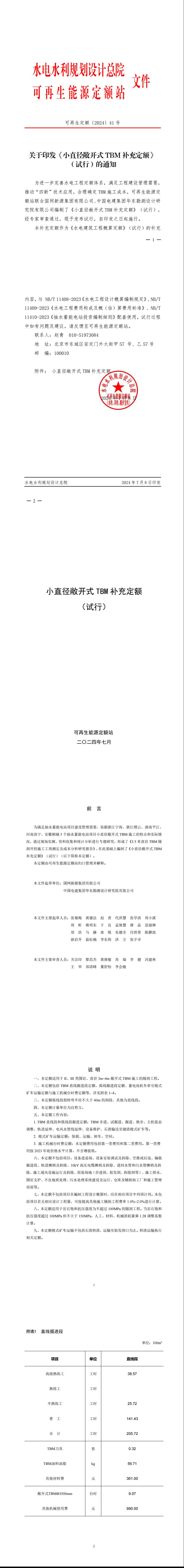 为进一步完善水电工程定额体系,满足工程建设管理需要,推动“四新”技术应用,合理确定TBM施工成本,可再生能源定额站联合国网新源集团有限公司、中国电建集团华东勘测设计研究院有限公司编制了《小直径敞开式TBM补充定额》(试行),经专家审查通过,现予发布试行,自印发之日起施行。