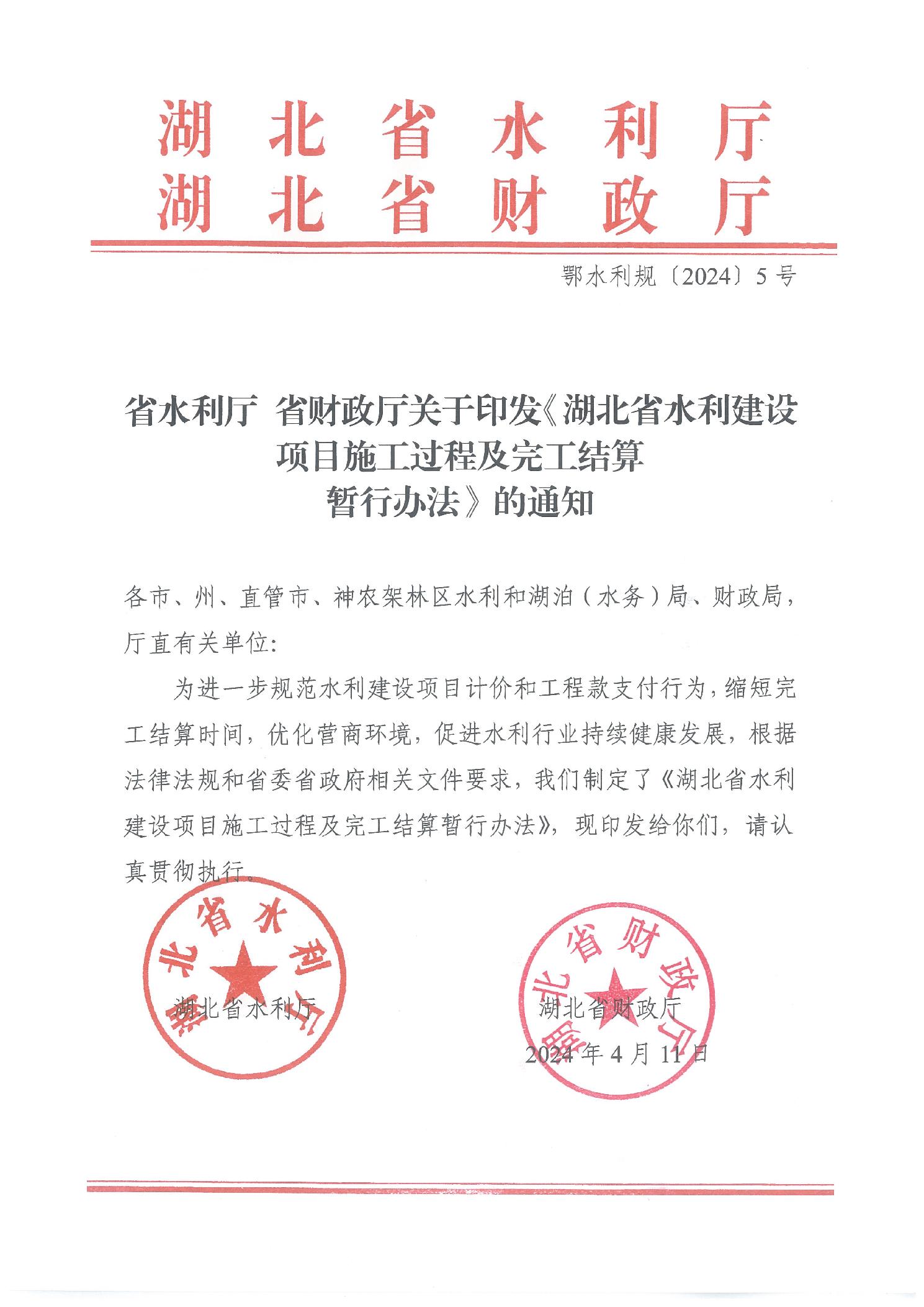 <转>湖北省水利厅 省财政厅关于印发《湖北省水利建设项目施工过程及完工结算暂行办法》的通知