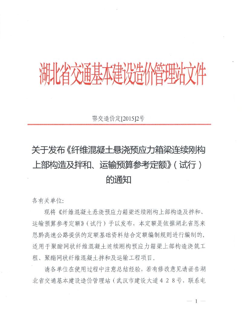 <转>鄂交造价定[2015]2号 湖北省《纤维混凝土悬浇预应力箱梁连续刚构上部构造及拌合、运输预算参考定额》(试行)的通知