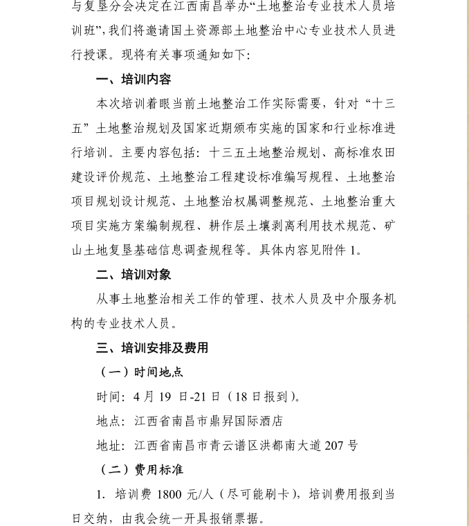 <转>土地学发垦字(2017)5号 2017年度土地整治专业技术人员第一期培训班的通知(南昌)