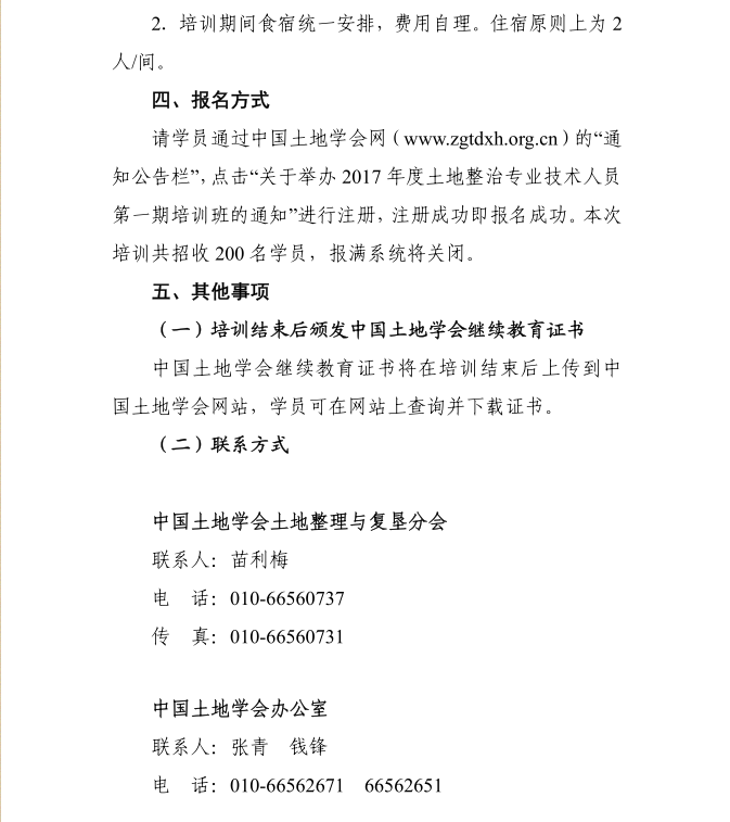 请学员通过中国土地学会网(www.zgtdxh.org.cn)的“通知公告栏”,点击“关于举办 2017 年度土地整治专业技术人员第一期培训班的通知”进行注册,注册成功即报名成功。本次培训共招收 200 名学员,报满系统将关闭。