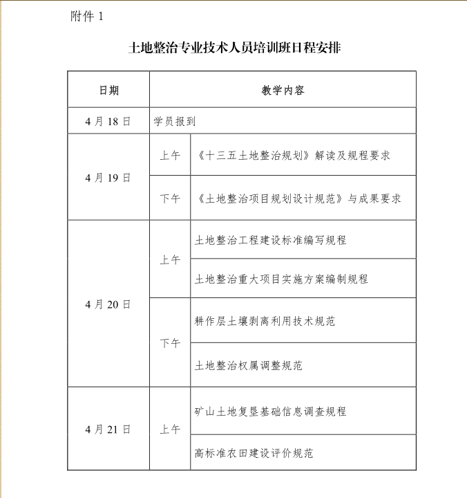 本次培训着眼当前土地整治工作实际需要,针对“十三五”土地整治规划及国家近期颁布实施的国家和行业标准进行培训。主要内容包括:十三五土地整治规划、高标准农田建设评价规范、土地整治工程建设标准编写规程、土地整治项目规划设计规范、土地整治权属调整规范、土地整治重大项目实施方案编制规程、耕作层土壤剥离利用技术规范、矿山土地复垦基础信息调查规程等。具体内容见附件 1。