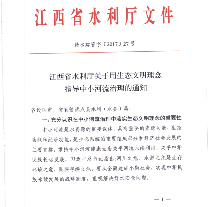 <转>赣水建管字[2017]27号 江西省水利厅关于用生态文明理念指导中小河流治理的通知