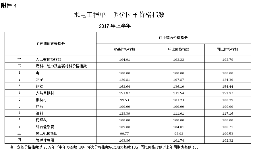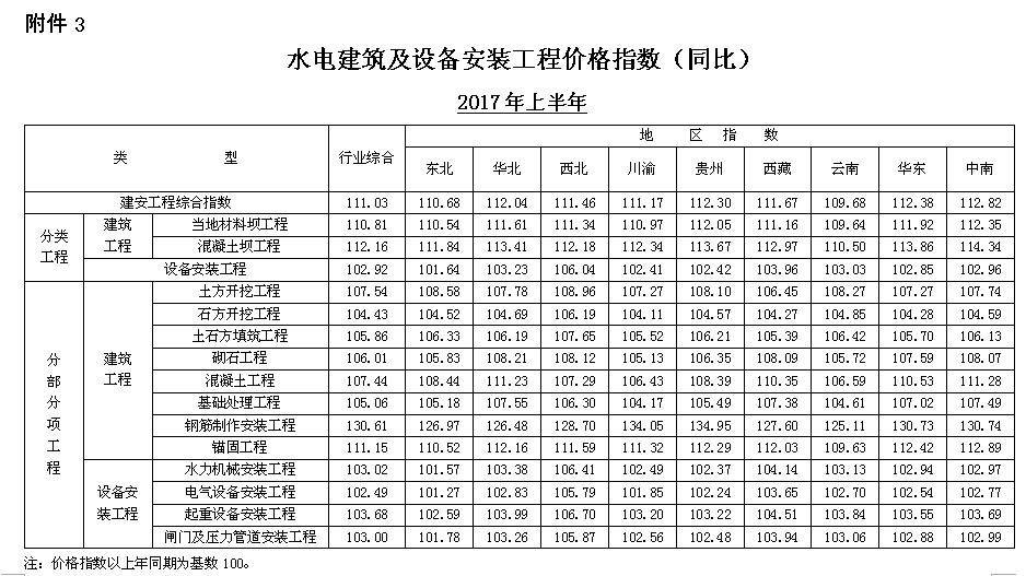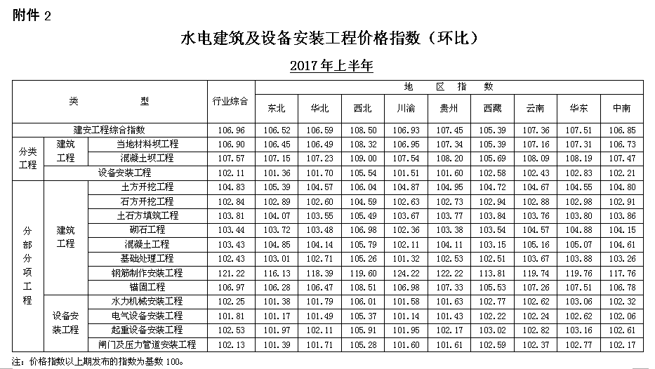 为综合反映水电工程投资随国家政策及市场情况的变化趋势,发挥工程造价管理部门积累价格资料、分析变化趋势、发布价格信息的作用,为政府和业主的水电建设项目投资决策和造价控制管理提供参考数据,经综合测算,现发布2017年上半年水电建筑及设备安装工程价格指数,供有关各方和业内专业人员参考使用。在使用中如有问题,请与我站联系。