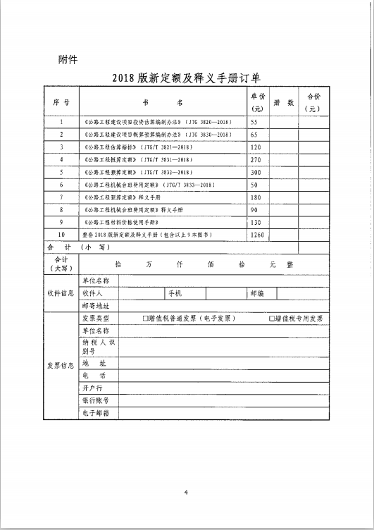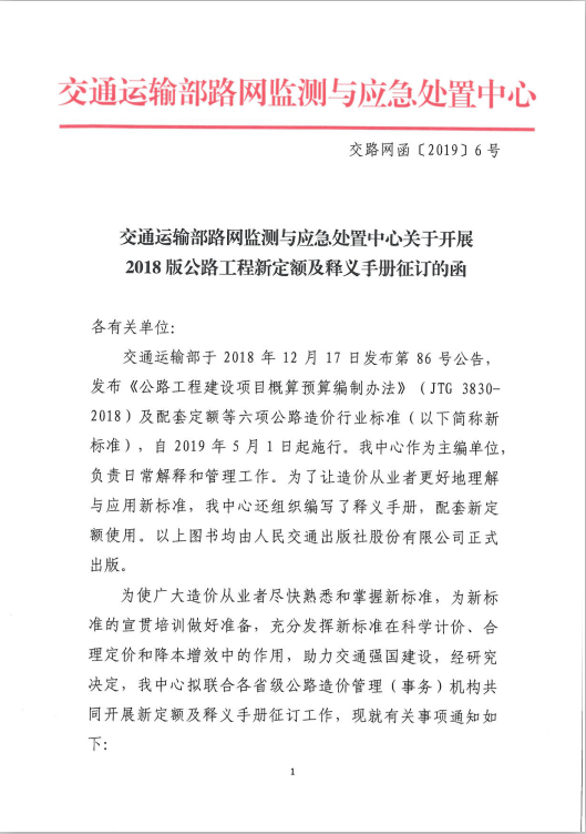 现发布《公路工程建设项目投资估算编制办法》(JTG 3820—2018)、《公路工程建设项目概算预算编制办法》(JTG 3830—2018)作为公路工程行业标准;《公路工程估算指标》(JTG/T 3821—2018)、《公路工程概算定额》(JTG/T 3831—2018)、《公路工程预算定额》(JTG/T 3832—2018)、《公路工程机械台班费用定额》(JTG/T 3833—2018),作为公路工程行业推荐性标准,自2019年5月1日起施行,原《公路工程基本建设项目投资估算编制办法》(JTG M20—2011)、《公路工程基本建设项目概算预算编制办法》(JTG B06—2007)、《公路工程估算指标》(JTG/T M21—2011)、《公路工程概算定额》(JTG/T B06-01—2007)、《公路工程预算定额》(JTG/T B06-02—2007)、《公路工程机械台班费用定额》(JTG/T B06-03—2007)同时废止。