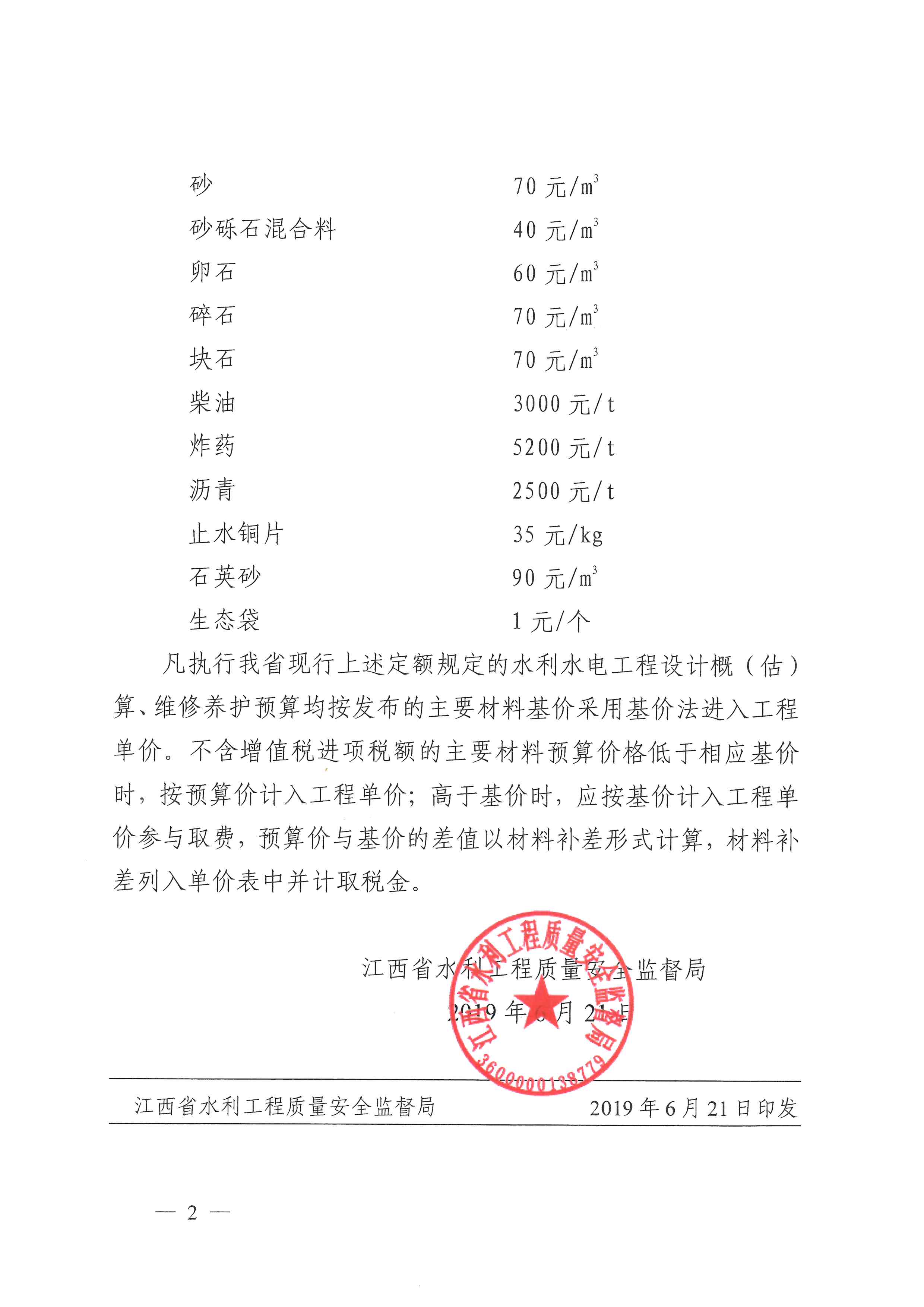 <转发>赣水质监综字[2019]9号 江西省2019年度下半年水利水电工程主要材料基价的通知