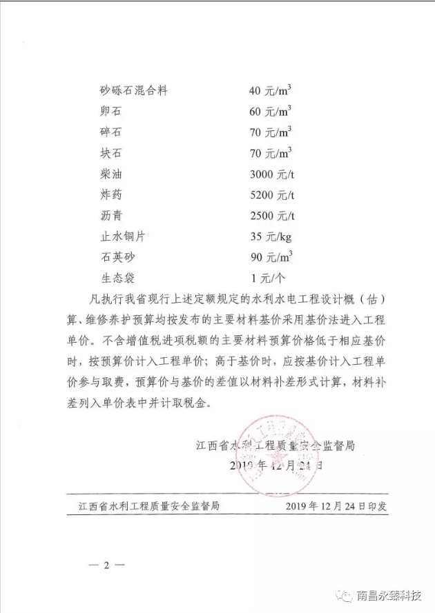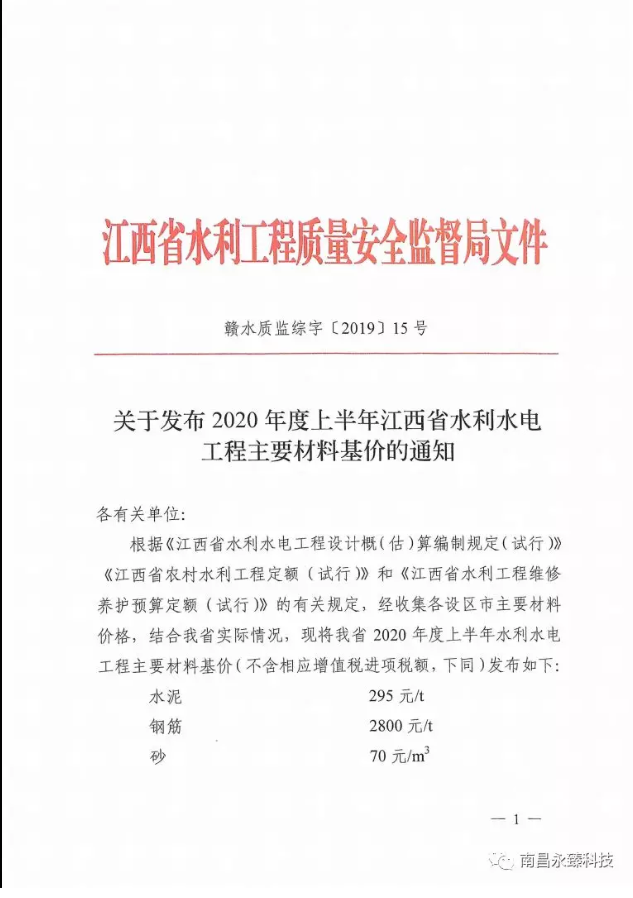 <转>2020年度上半年江西省水利水电工程主要材料基价的通知 赣水质监综字[2019]15号