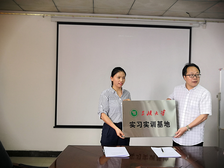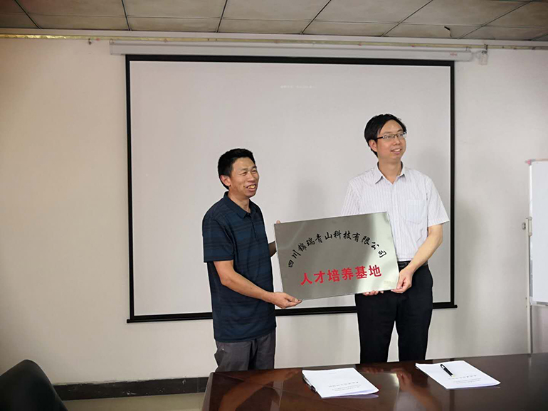 随后,彭辉院长、白锋总经理作为双方代表,在校外实践基地合作协议上签字并亲切握手,至此锦瑞青山公司正式与三峡大学水利环境学院建立了合作关系。在接下来的授牌仪式中,锦瑞青山公司向学院授予“四川锦瑞青山科技有限公司人才培养基地”的牌匾。锦瑞青山公司副总经理任富君代表公司接受学院授予的“三峡大学实习实训基地”的牌匾。