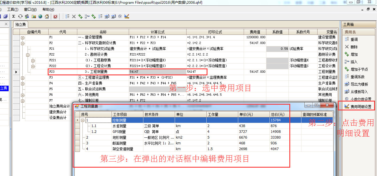 计算方式:可自行在计算公式中编辑自己的计算过程,同时软件还提供了 列项计算方式即功能按钮区的 【费用明细设置】,详细操作如下图示: