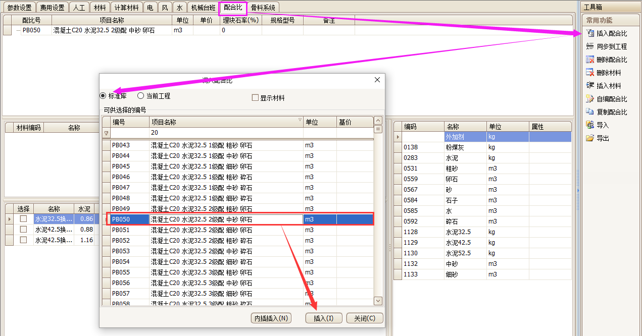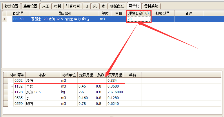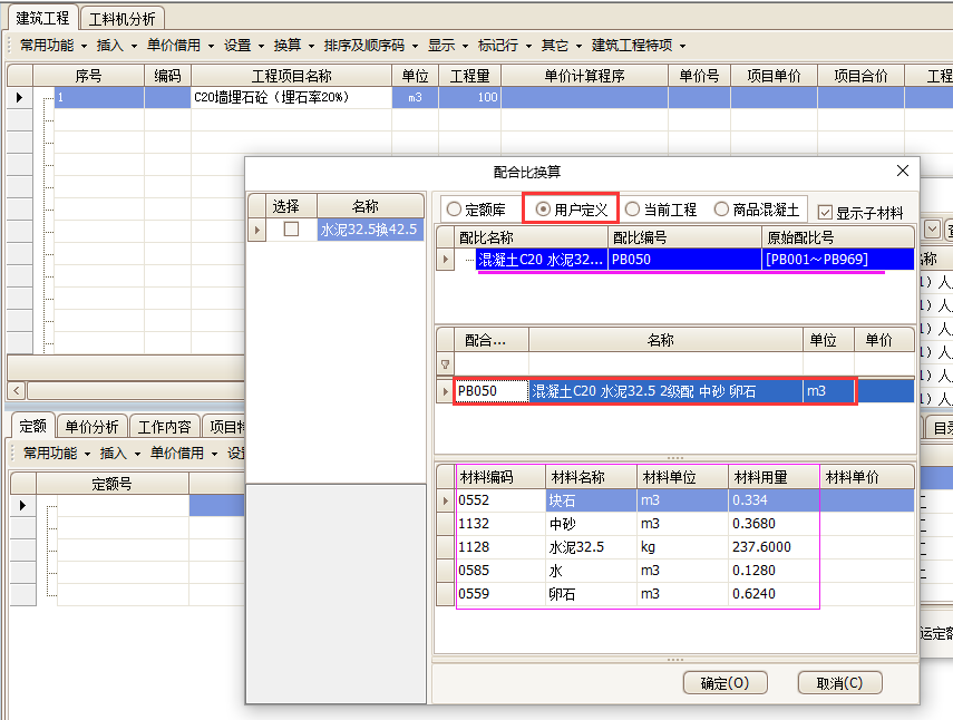 第二步:项目中,套用定额的 配合比弹窗界面,选择【用户自定义】选项,把我们设置好的 埋石配合比【双击】选择进去;