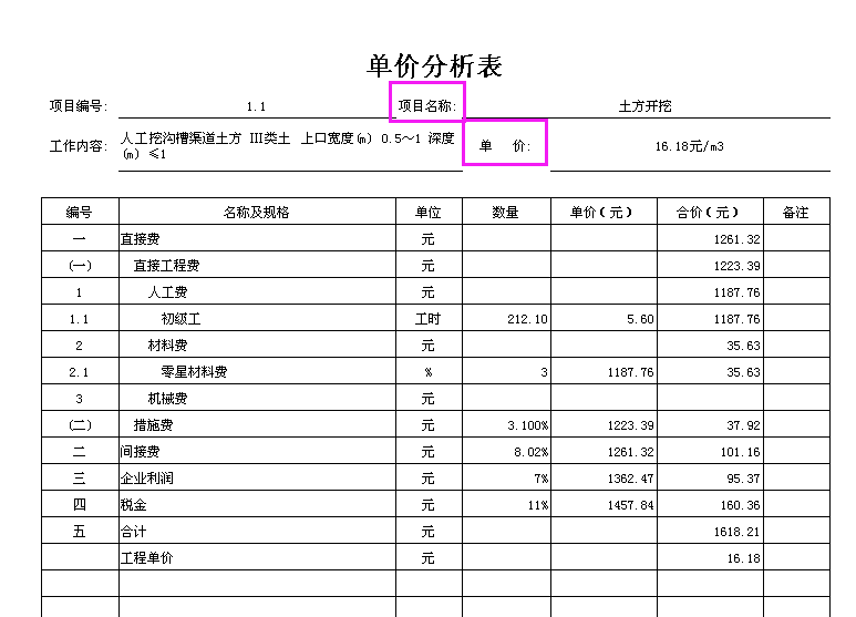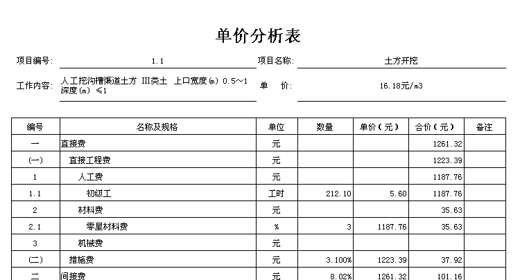 水利单价分析表
