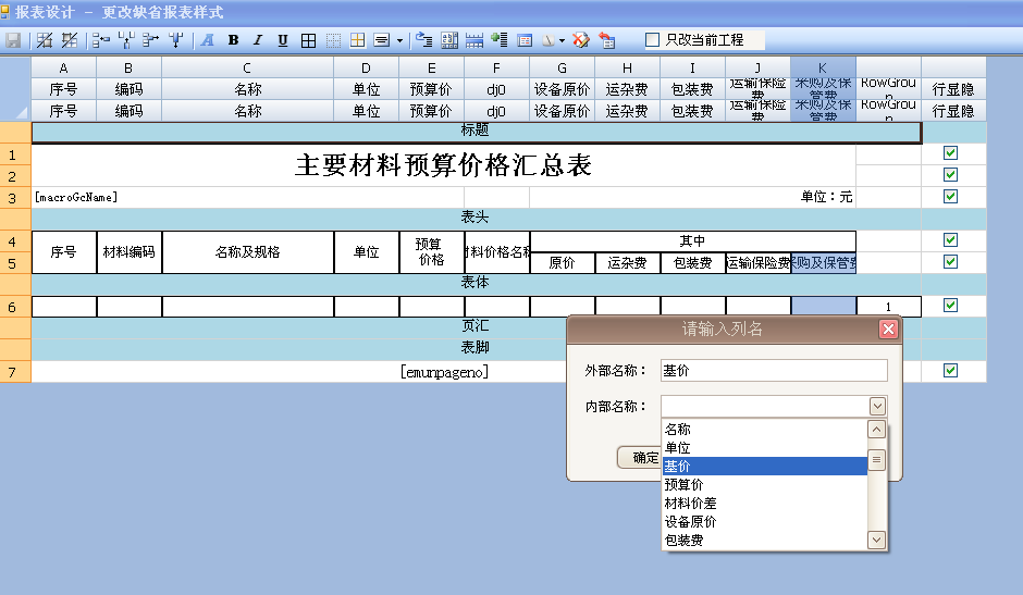 3、选中需要显示的列位置,点击“插入列”按钮,软件会弹出“外部名称”、“内部名称”。(外部名称可以根据自己理解命名,内部名称为软件内部变量),如图,插入基价列: