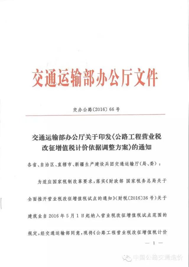 <转>交办公路[2016]66号 交通运输部办公厅关于《公路工程营业税 改征增值税计价依据调整方案》的通知