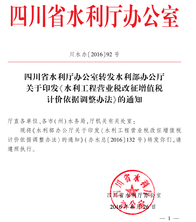 <转>川水办(2016)92号 四川省水利厅办公室转发水利部办公厅 关于印发«水利工程营业税改征增值税 计价依据调整办法»的通知