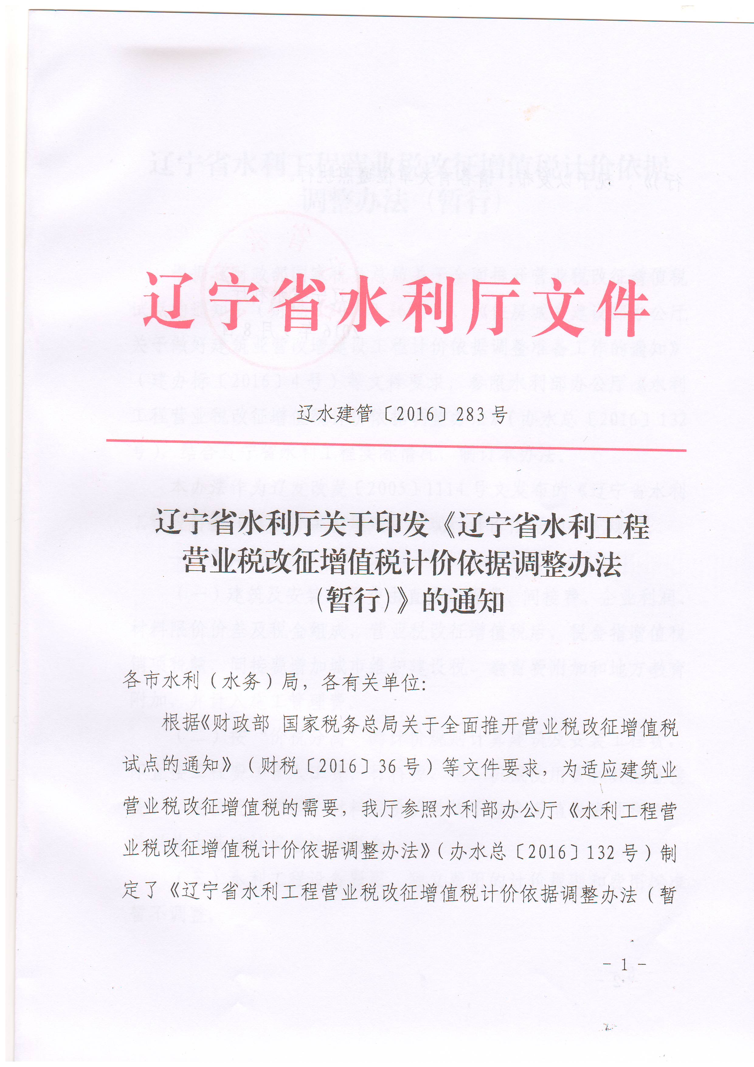 辽宁省水利工程营业税改征增值税计价依据调整办法(暂行)