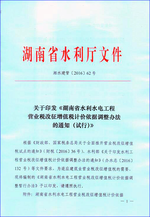 湖南省水利厅印发《湖南省水利水电工程营业税改征增值税计价依据调整办法(试行)》的通知