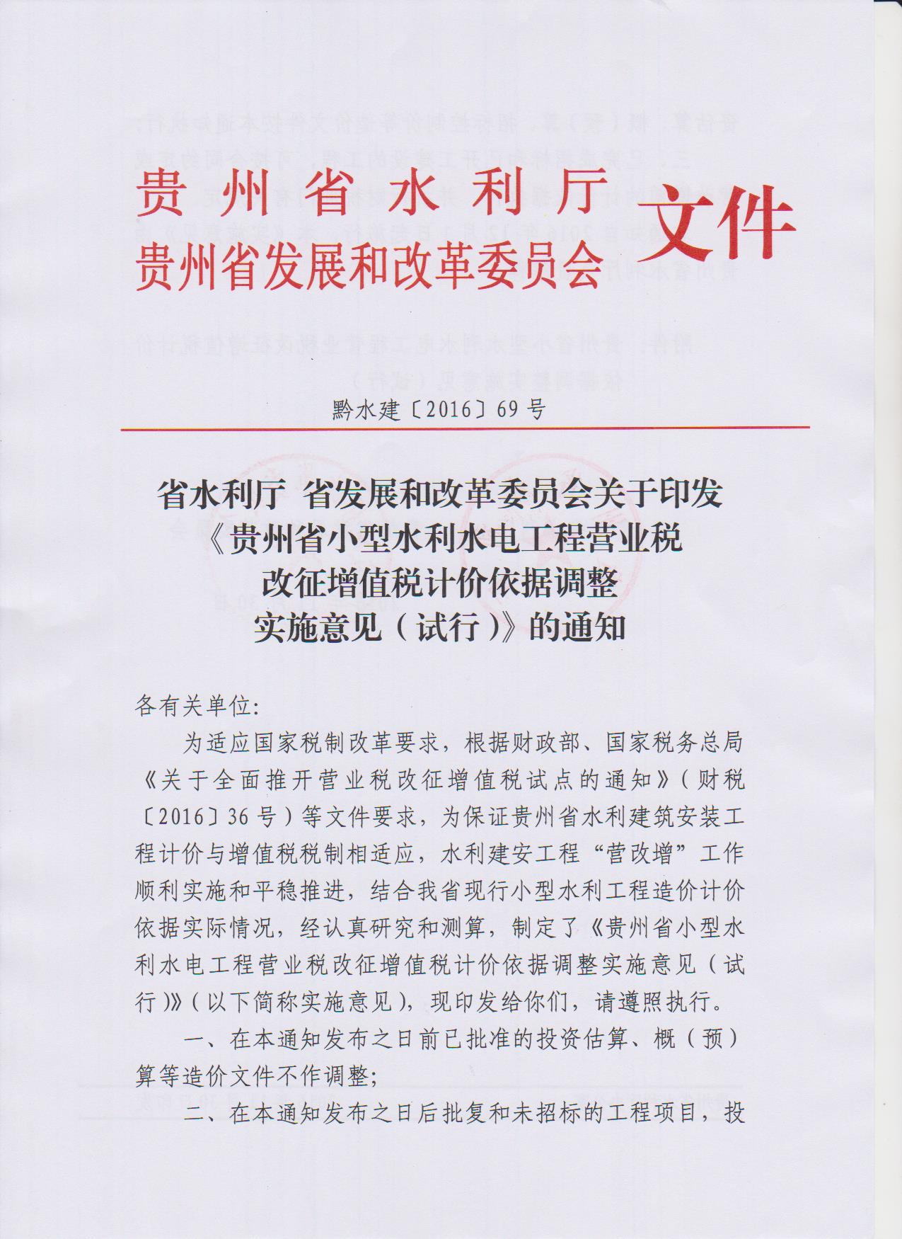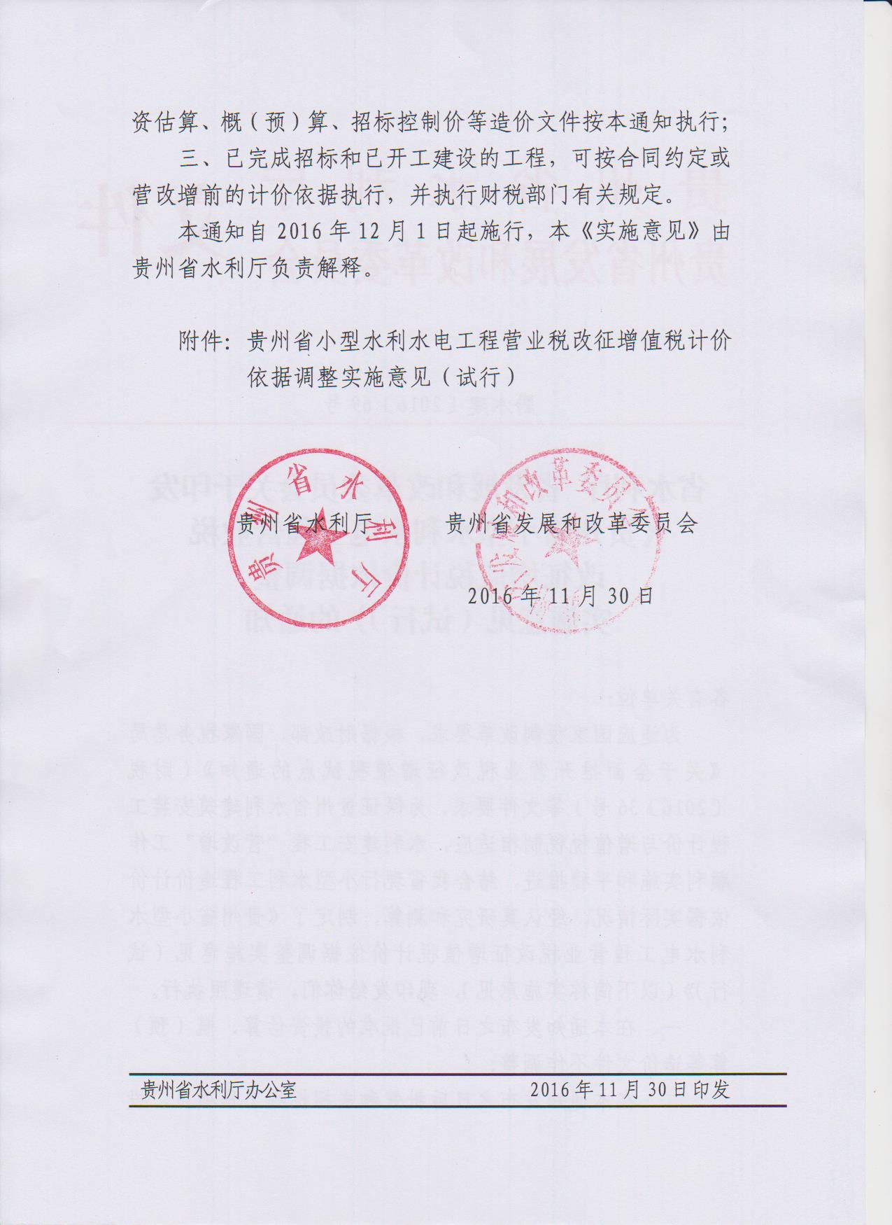 贵州省小型水利水电工程营业税改征增值税计价依据调整实施意见(试行)