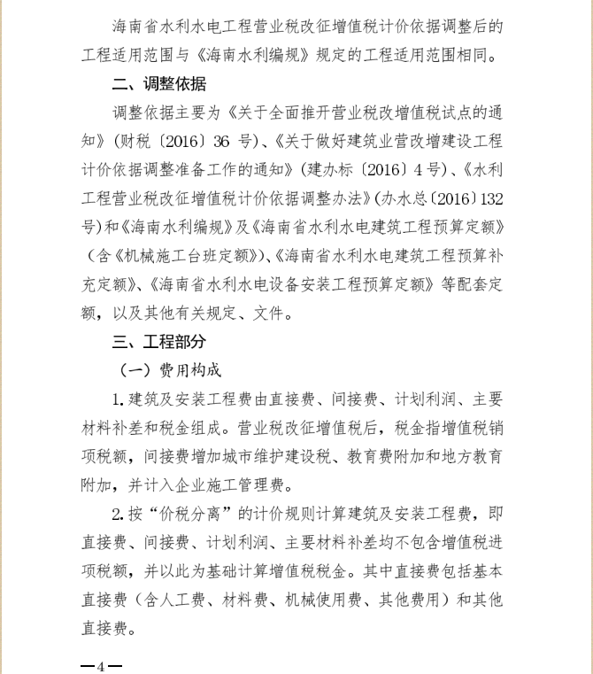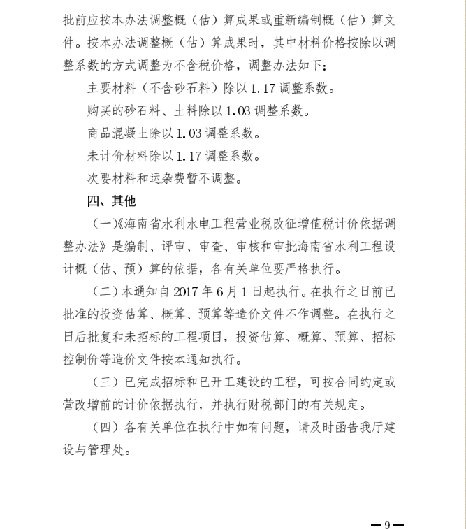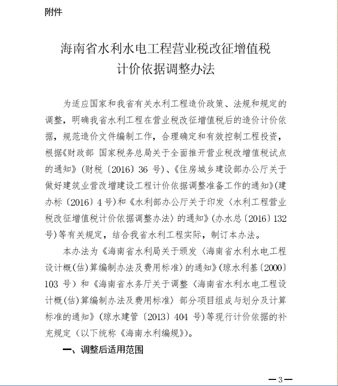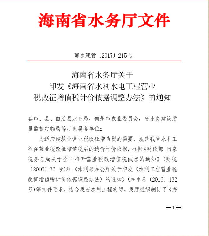 <转>琼水建管(2017)215号 海南省水务厅关于印发<海南省水利水电工程营业税改征增值税计价依据调整办法>的通知