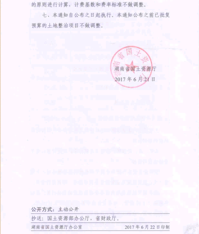 <转>湘国土资发(2017)24号 湖南省国土资源厅关于增值税条件下调整土地整治项目预算计价依据的通知