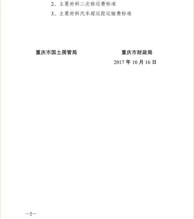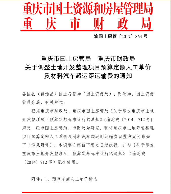 <转>渝国土房管(2017)863号 重庆市国土房管局 重庆市财政局 关于调整土地开发整理项目预算定额人工单价及材料汽车超运距运输费的通知