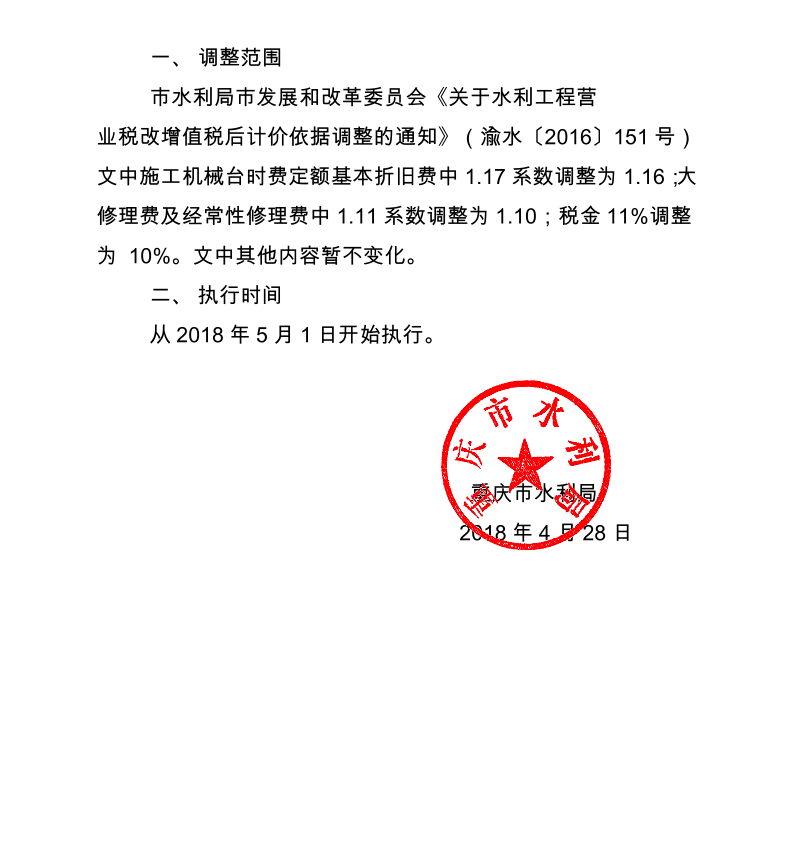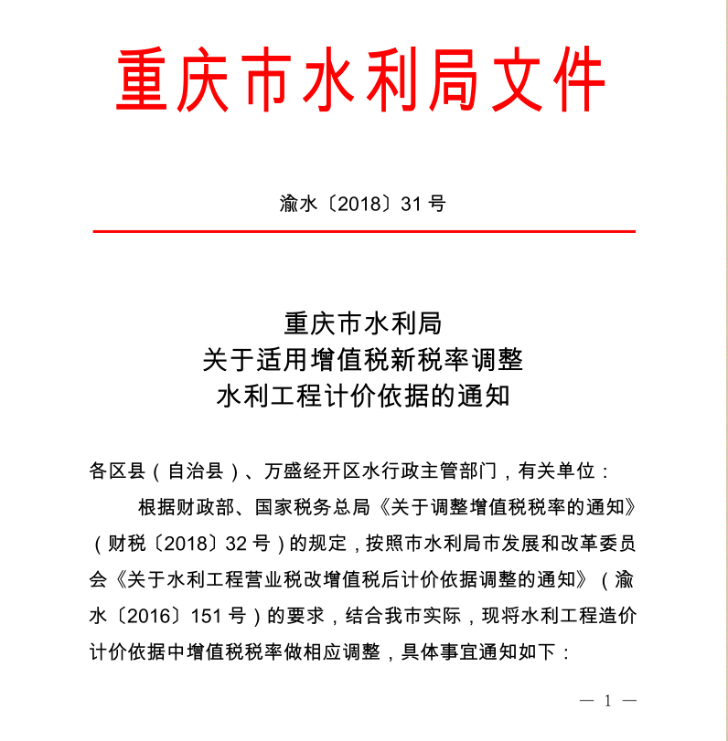 <转>渝水[2018]31号 重庆市水利局关于适用增值税新税率调整水利工程计价依据的通知